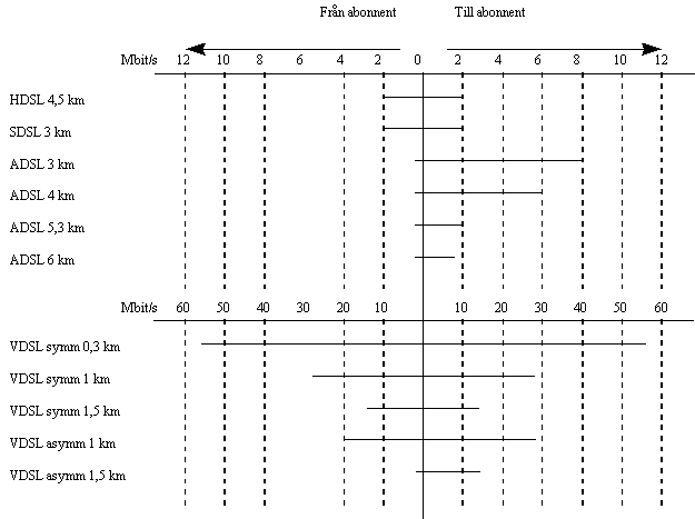 Höghastighetskanalens överföringshastighet (från telefonstation till abonnent) är avståndsberoende: