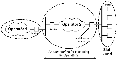I de fall en slutkund erhåller sin Internettjänst via en lokal operatör och den lokala operatören är ansluten till övriga Internet via en annan operatör, finns risk att det råder oklarhet i respektive parts ansvarsområde och vilka rutiner som gäller vid felsökning. I detta avsnitt lämnas ett förslag till ansvarsfördelning och sådana rutiner.