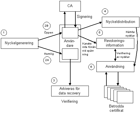 I bilden nedan återfinns en beskrivning av de funktioner som måste ingå i en infrastruktur för nyckelhantering (Public Key Infrastructure).