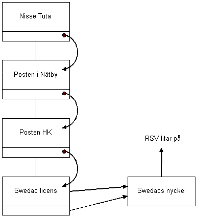 Nisse Tuta skapar och signerar initialt sina nycklar. Nycklarna tar han med sig till postkontoret i Nätby där han bor. Posten kollar Nisses identitet samt signerar Nisses nyckel med hjälp av posten i Nätbys certifikat. Posten i Nätbys certifikat är signerat av Posten HK. Posten HK har certifierats att vara CA i Sverige. Certifieringen kan till exempel innebära att Posten HK:s nyckel har signerats med Swedacs nyckel. När nu Nisse skall skicka ett signerat meddelande till RSV så kan RSV verifiera hela kedjan och därigenom lita på att Nisses nyckel är korrekt.