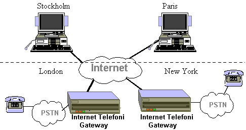 Figur 20-1 visar hur Internet kan användas för telefonsamtal över Internet. Alla användare kan tala med alla oavsett utrustning. Användarna i New York och London använder en gateway som konverterar talet till Internettrafik så de kan tala med PC-användarna. Om personer i London och New York skall tala med varandra sker konverteringen två gånger.
