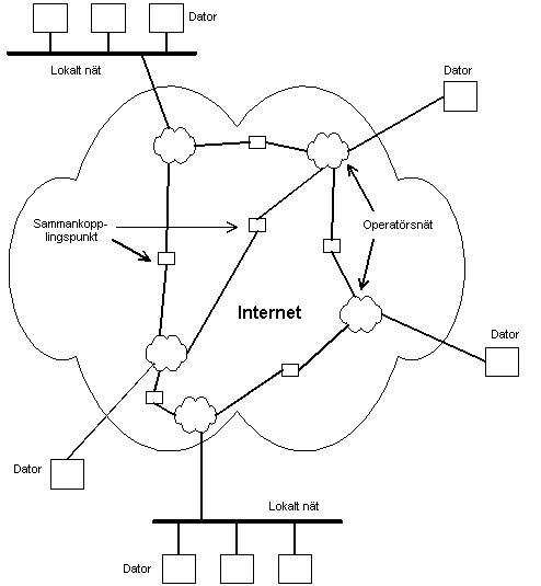 Det som användaren ser som ett nät består emellertid av ett stort antal sammankopplade delnät. De olika delnäten utgörs i stort sett av olika operatörers nät. Till operatörernas nät ansluts olika organisationers (lokala) nät och datorer: